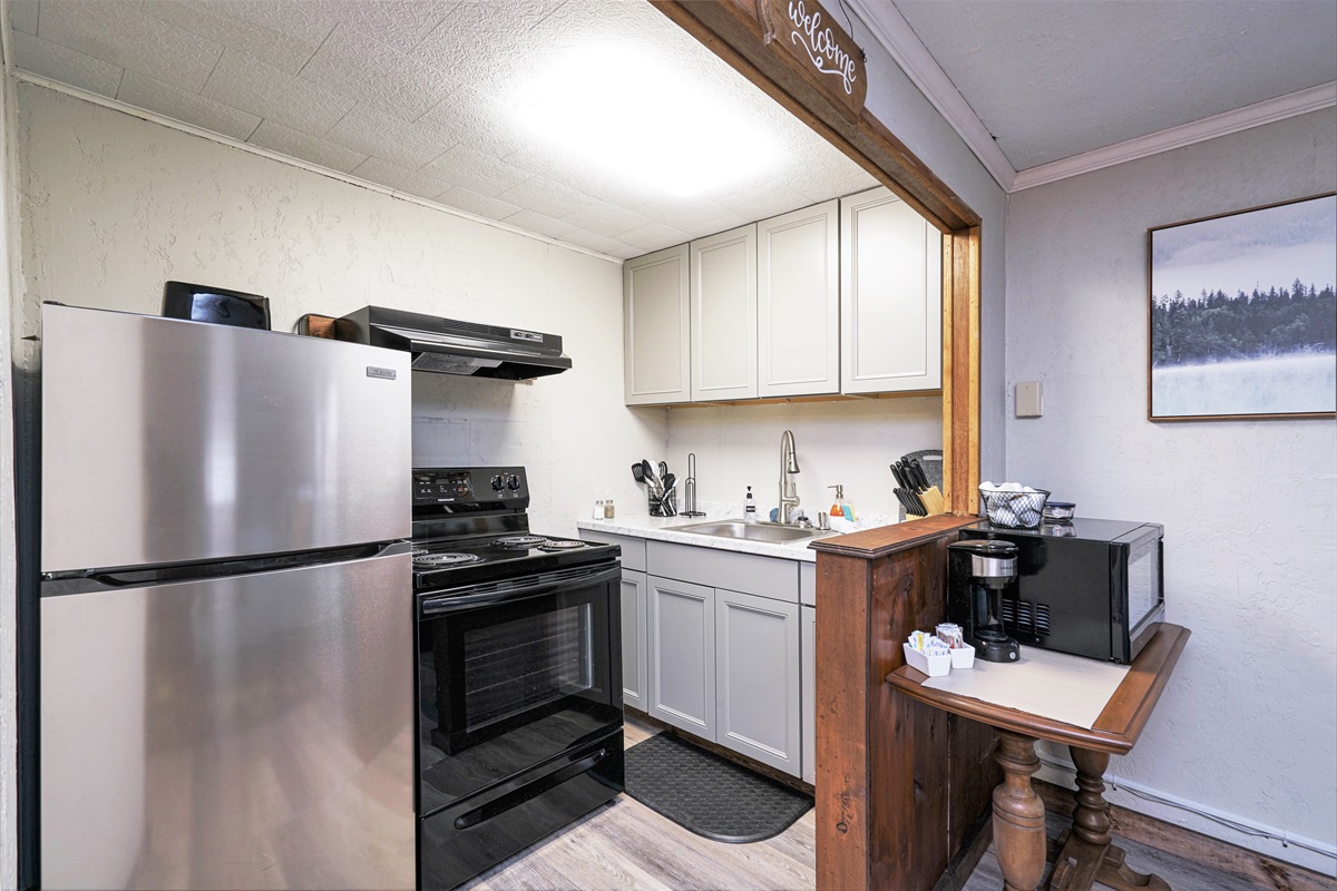 Complimentary Wi- Fi and coffee. The kitchen comes fully loaded with stainless steel appliances such as a fridge and electric stove along with glasses, mugs, dishes and cutlery.